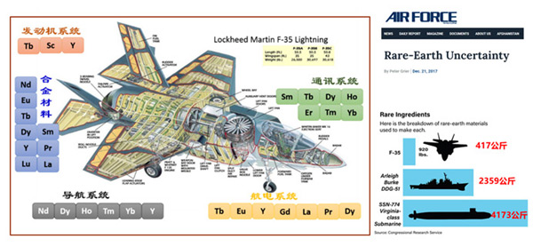 稀土具有极高的经济价值和战略价值。从资源价格上看,重稀土的市场价格远高于轻稀土和中稀土。稀土在国防军事高科技领域也有无可替代的作用。例如,美国弗吉尼亚级核动力潜艇每艘使用约4173公斤稀土金属、阿利伯克导弹驱逐舰需要大约2359公斤稀土金属、F-35联合攻击战斗机需要约417公斤的稀土金属。