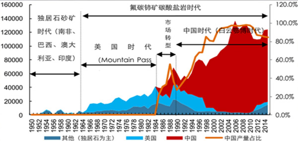 目前实际开采的稀土矿物只有氟碳铈矿、独居石、磷钇矿,以及离子型稀土矿。我国最重要的两大特色稀土资源基地,一个是内蒙古自治区白云鄂博稀土矿,另一个是南方离子吸附型稀土矿。